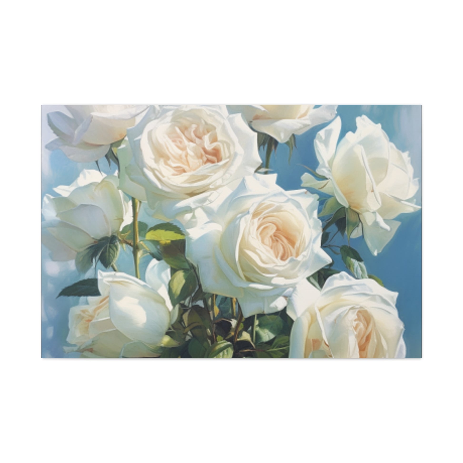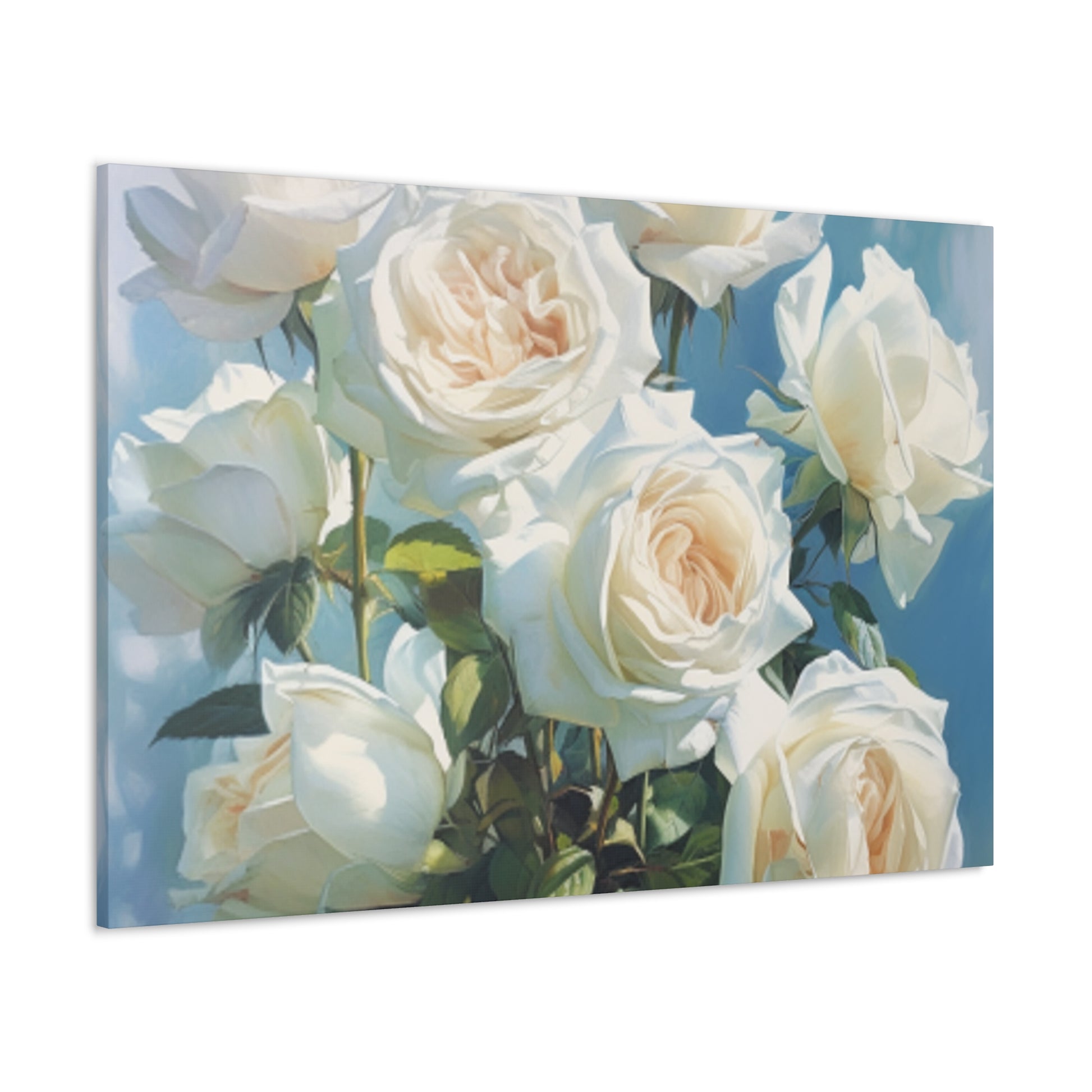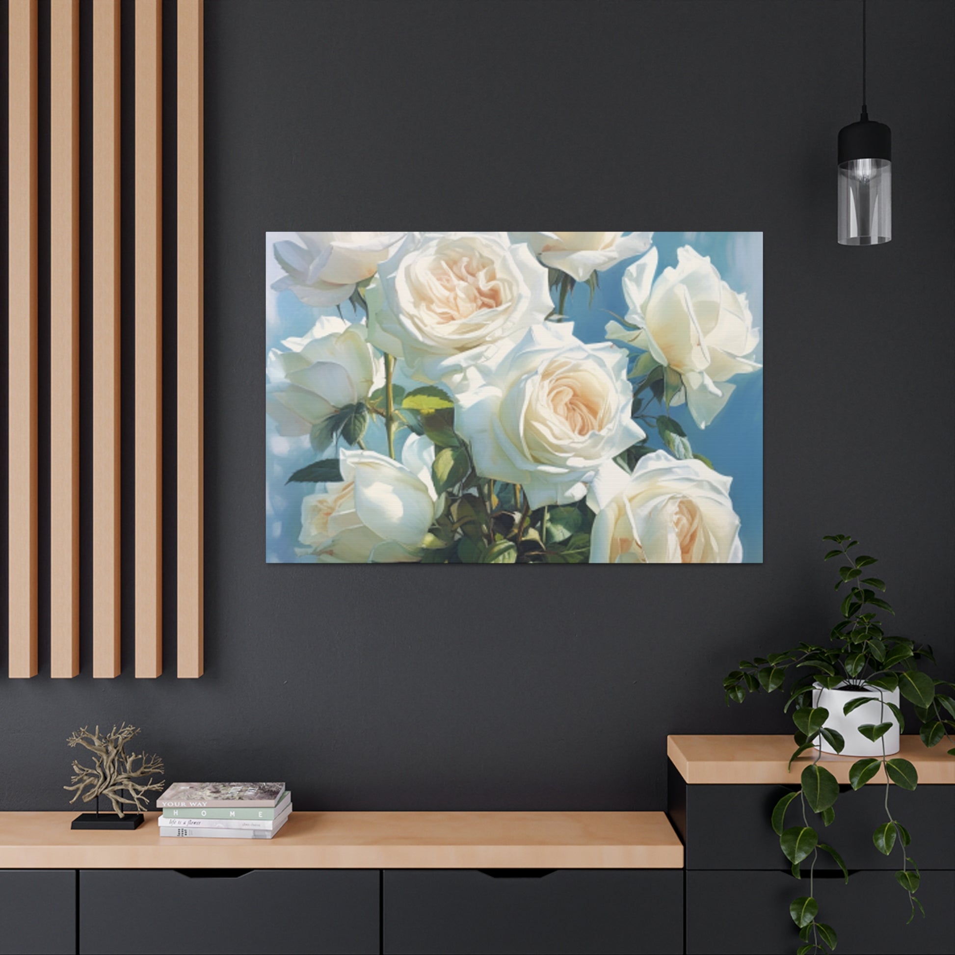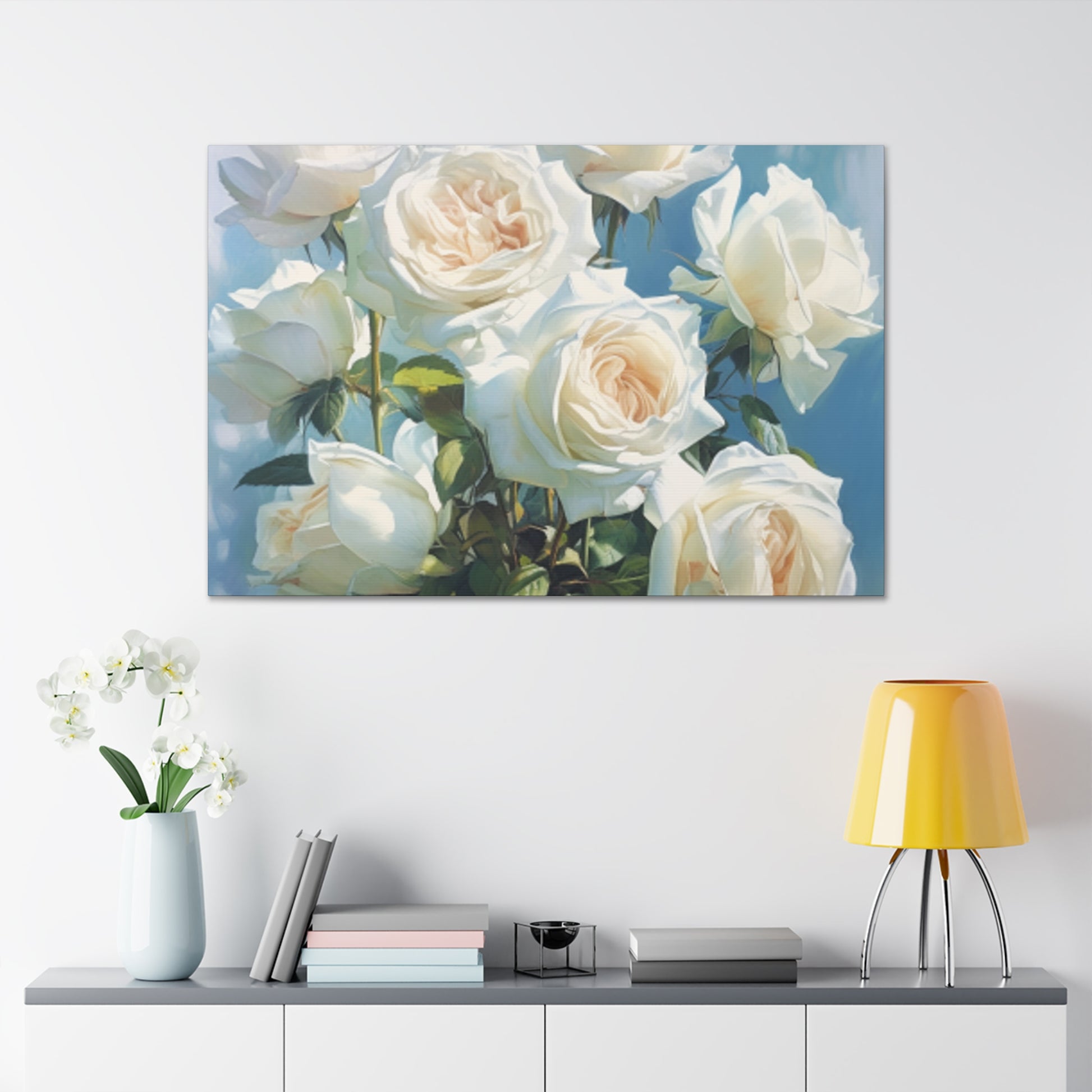 Discover the beauty of Pure White Roses In Bloom large wall art for your living room or bedroom from BestCanvasArt. com.