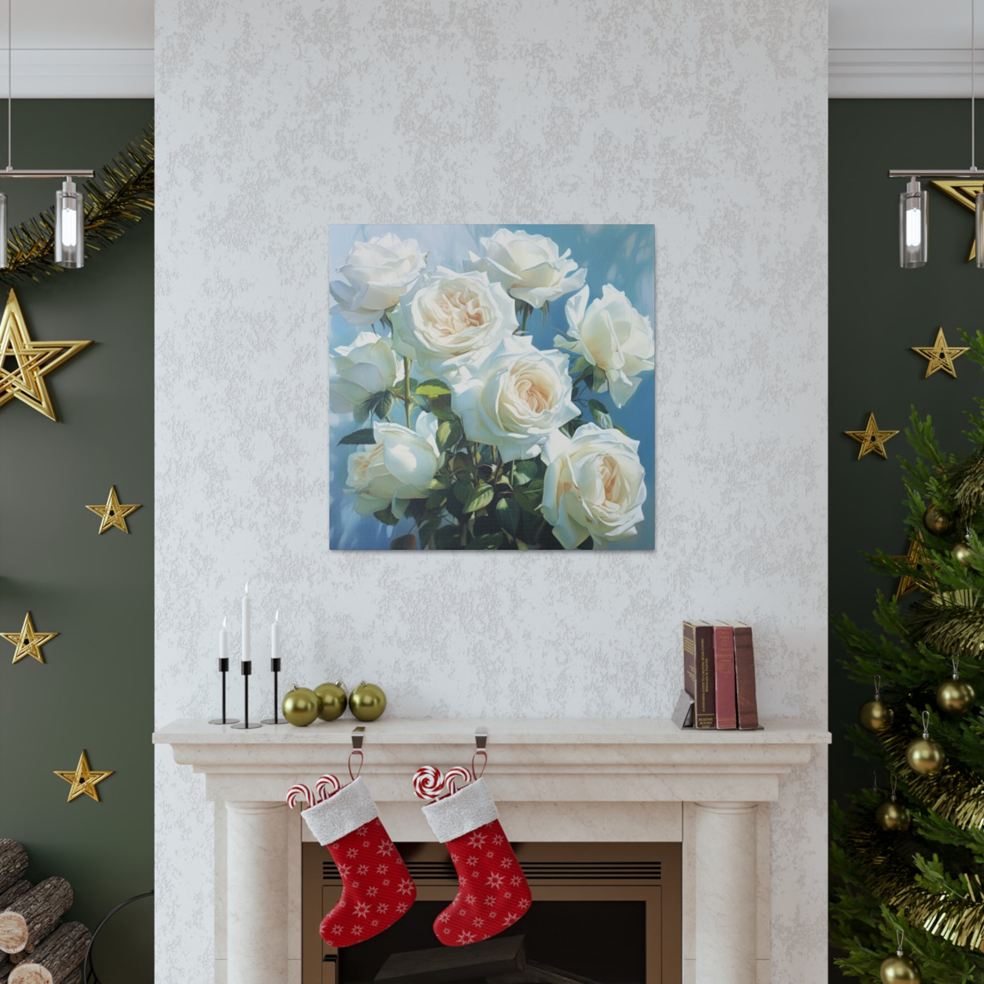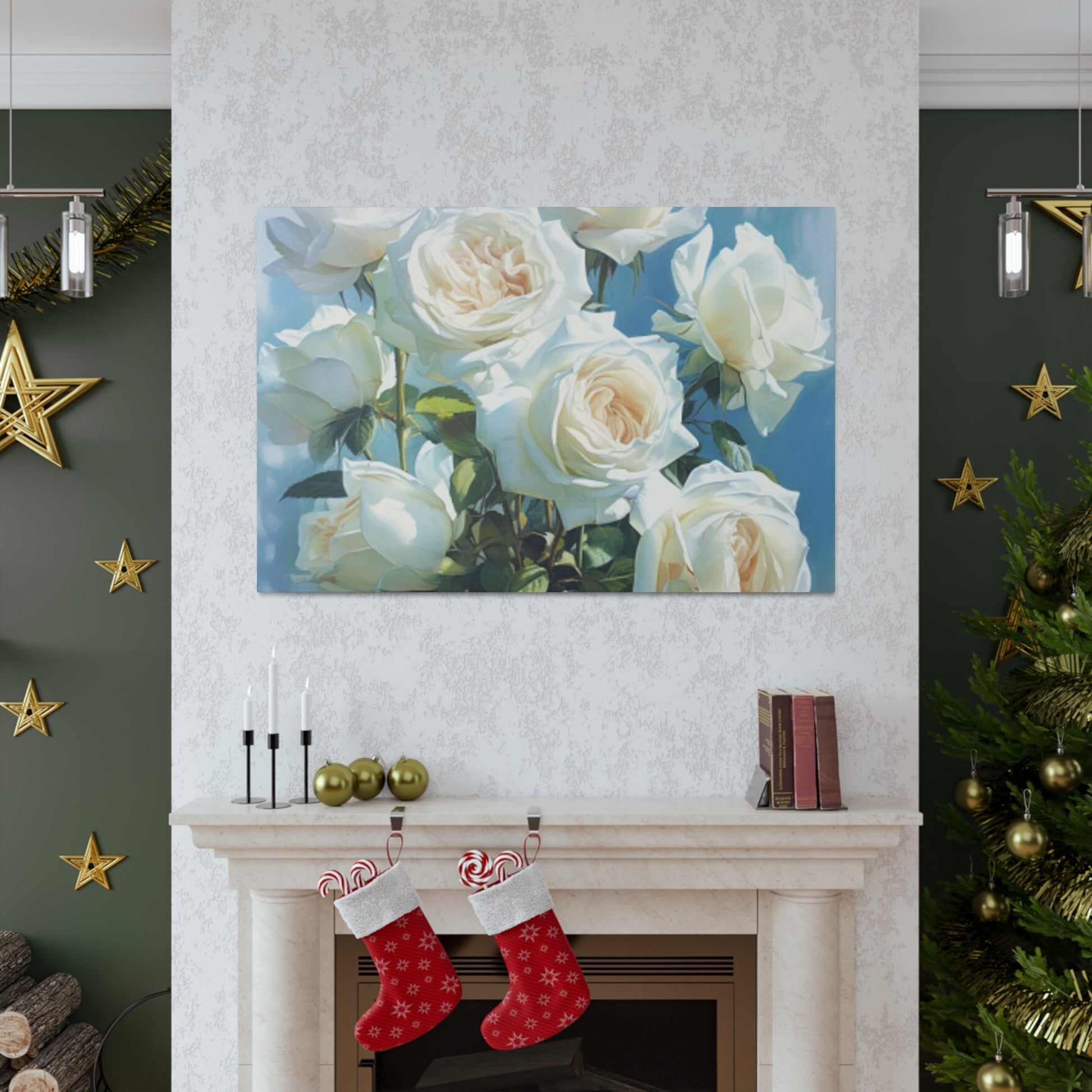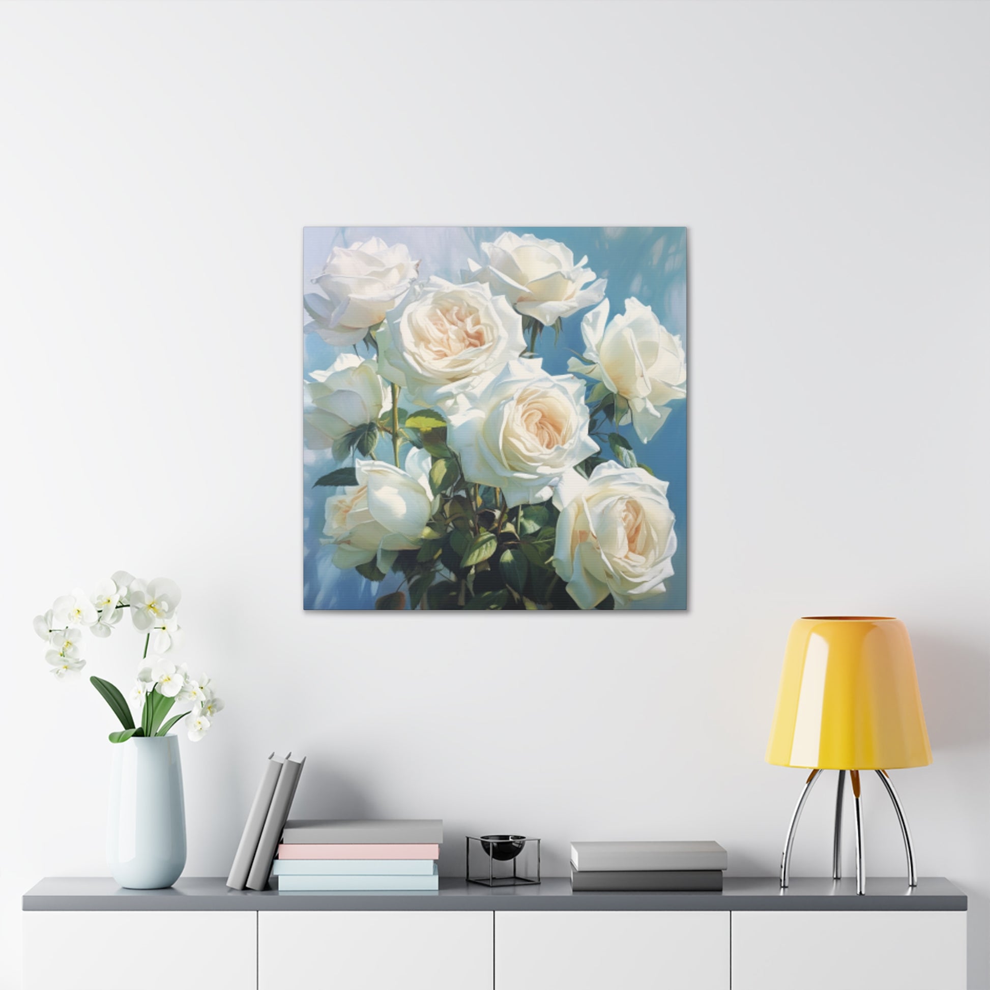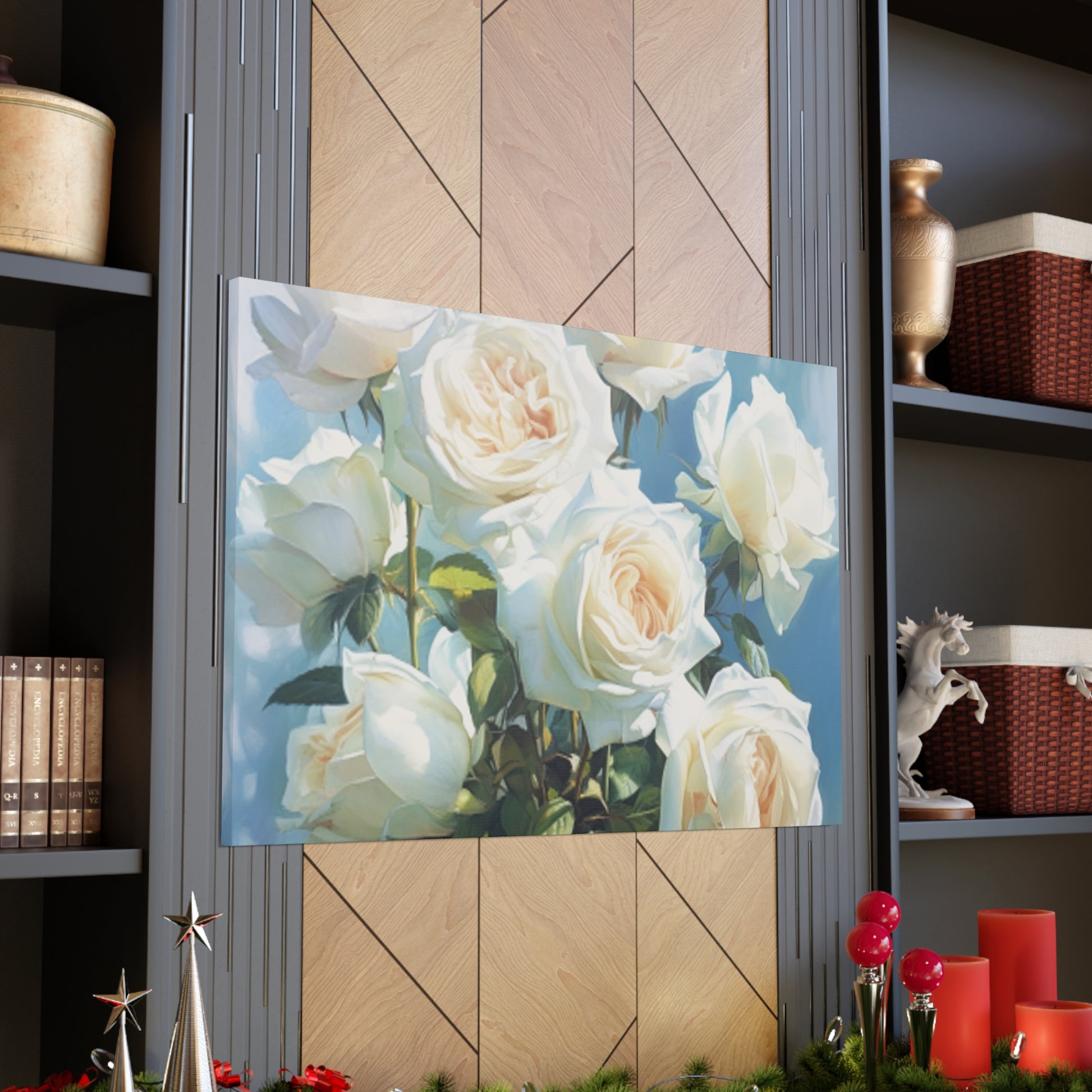Discover the beauty of Pure White Roses In Bloom large wall art for your living room or bedroom from BestCanvasArt. com.