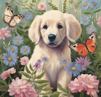Revel in the beauty of majestic butterflies and a sweet white retriever puppy with the White Retriever Puppy And Butterflies Diamond Painting Kit from DiamondPainting.com. Exquisitely designed with premium quality rhinestones, this diamond painting will surely be the highlight of your collection! The kit comes with everything you need to get started, including durable canvas, all the rhinestones you need, a tool set, and more.